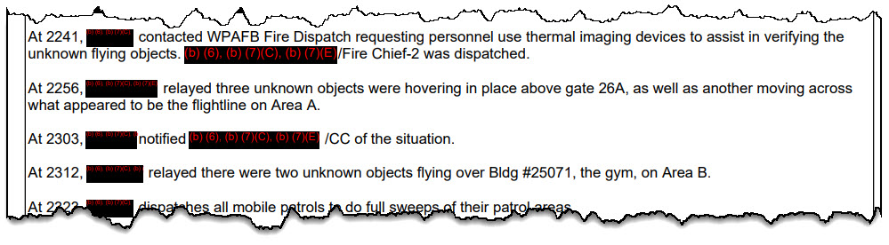 Responding patrols confirmed sightings near the National Museum of the U.S. Air Force. One officer reported, “The objects appeared to be lights moving as a group, but too high up to get an accurate assessment of what they looked like.” Another patrol saw “two blinking red and white objects in the sky moving slowly.”