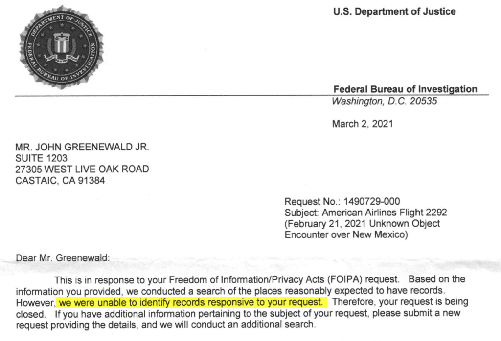Despite American Airlines recommending to The WarZone to contact the FBI for more information; the FBI told The Black Vault in a FOIA response dated March 2, 2021, that they were unable to find any records relating to the event.