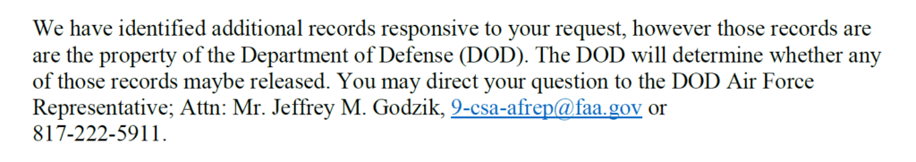 After an appeal, on July 22, 2021, the FAA sent The Black Vault records pertaining to the above flight. Interestingly, some of the responsive records found were the property of the Department of Defense (DoD).