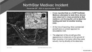 One case describes an incident involving a medevac helicopter attempting to land in New Jersey. “Three drones were observed in close proximity to that medevac unit forcing the unit to abort the landing and look for another landing zone,” the document states. At the same time, three commercial aircraft were on approach to the SOLEBERG VOR, with their alignment giving “the appearance to observers on the ground of them hovering in formation while they were actually moving directly at the observers.”