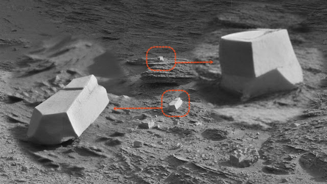 What stands out in the image are two objects, that appear strikingly out of place amid the natural Martian landscape of rocks and boulders. Their sharp edges, right angles, flat surfaces, and geometric symmetry suggest they may have been shaped by advanced cutting tools rather than natural erosion.