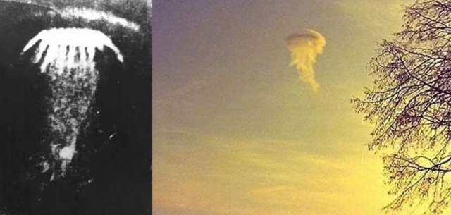 Image left: squid like entity spotted in Russia 1977 (credit MUFON)