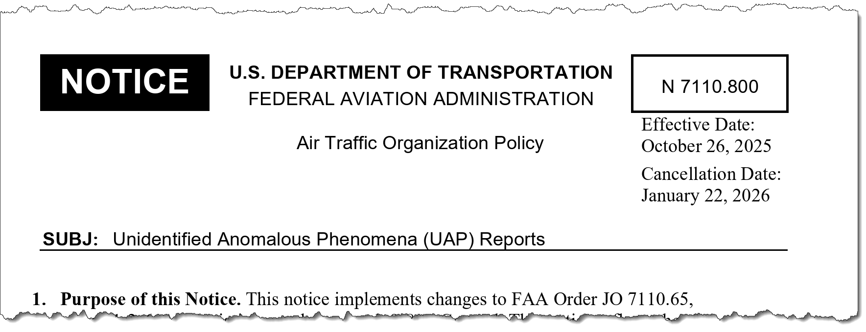 The update was issued under FAA Notice N 7110.800, effective October 26, 2025, and applies to all Air Traffic Organization (ATO) personnel. The notice modifies two key sections of FAA Order JO 7110.65, the governing document for air traffic control procedures. Specifically, it updates paragraph 1-2-6, “Abbreviations,” and paragraph 9-8-1, “General,” to remove the word UFO and introduce UAP in its place.