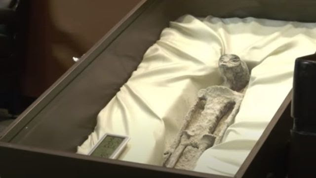 The two small “non-human” bodies with three-fingered hands and feet and elongated skulls were displayed in transparent containers for all to witness are believed to be one thousand-years old and are not part of our planet’s evolutionary history.