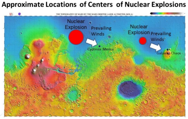 The absence of craters at the sites indicates that the bombs were likely detonated above ground in an air blast, which worsens the global fallout but dampens the immediate ground impact. Conversely, if detonated on the ground, the local devastation is immense but the global impact is minimized. Regardless, these explosions were powerful enough to cause a global catastrophe and significantly alter Mars’ climate. According to Brandenburg, the nuclear attack apparently wiped out two races: the Cydonians and Utopians.