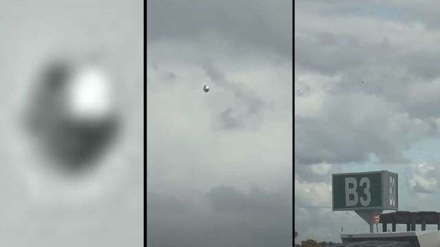 The live footage captures a steady, silver orb hovering in the sky, its metallic surface gleaming in the sunlight. The orb maintaining a consistent position, defying the characteristics commonly associated with conventional aircraft.