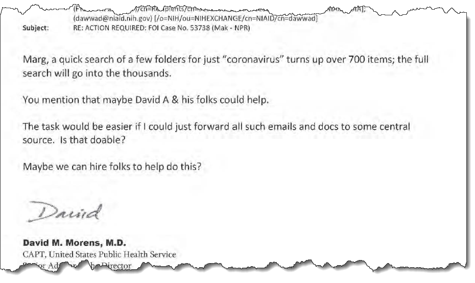 The emails show Dr. Morens expressing concern over the volume of emails that could be scrutinized under FOIA, indicating the potential for thousands of documents to be reviewed. His discussions include suggestions to streamline the process, such as forwarding emails to a central source or hiring additional help to manage the overwhelming task of compliance. This illustrates the challenges faced by NIH officials in balancing transparency with the demands of the pandemic.