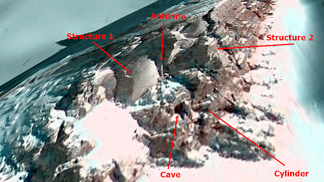 These ancient structures, the cave (or portal), and the strange cylinder (resembling a UFO) in the air, as well as next to the first structure, you can see what looks like a large antenna, or crane, all contribute to the mysterious ambiance surrounding this location.