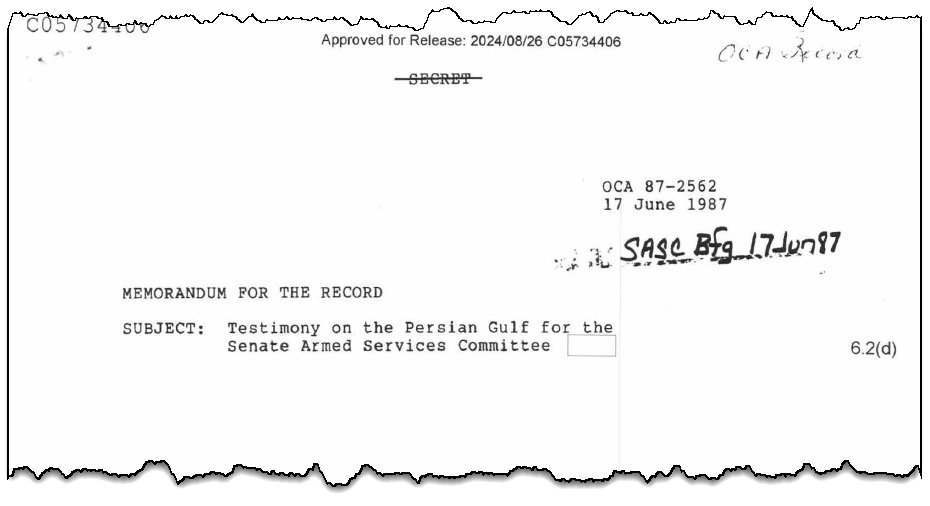 The below document was released in response to a Mandatory Declassification Review request filed by The Black Vault on November 15, 2021. This request pertained to the re-review of testimony on the Persian Gulf for the Senate Armed Services Committee, documented under CIA-RDP90B00017R000300720003-0. An older, more redacted version, can be seen here.