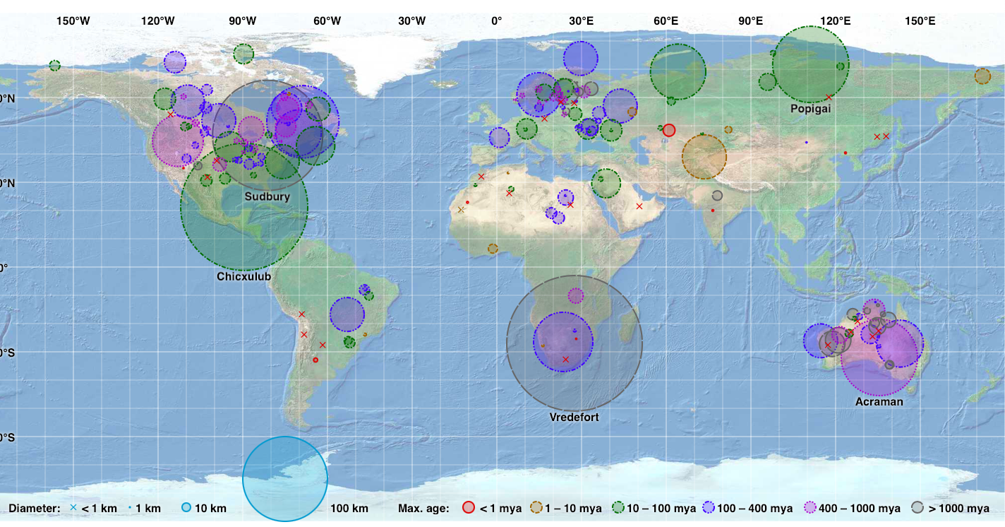 The famous Chicxulub crater in Mexico, which killed the dinosaurs 66 million years ago, was similarly hidden until the 1970’s when geologists found it buried under limestone and ocean sediments. The crater is estimated to be just under 200 km in diameter, and has since filled with ocean sediment.