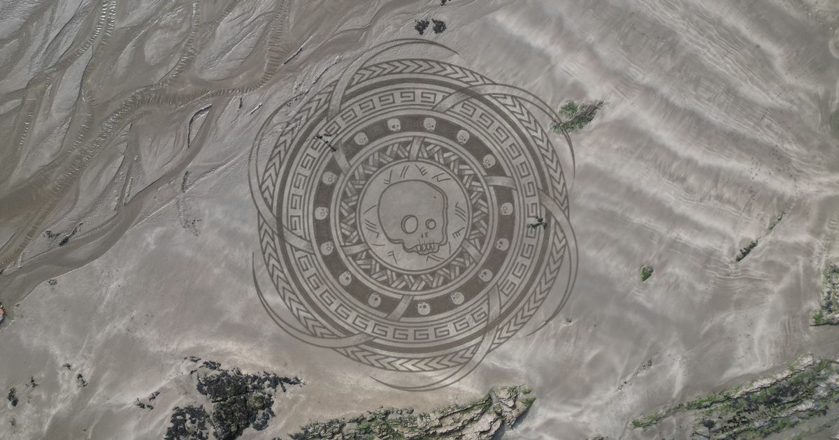 Etched into the sand, the mysterious markings have surprised locals and visitors alike, just in time for Halloween – thanks to an ancient hieroglyphic style, and cryptic message spanning the shoreline.