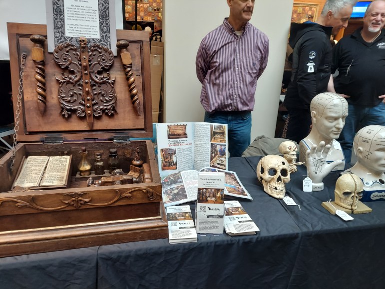 After the first lecture, I took an opportunity to tour the scene. The event was confined to a small section of a performing arts center at Bucks County Community College, so vendors were grouped in one row leading towards the theater. This meant mediums and psychics were placed alongside vampire hunters and MUFON flacks, creating a true melting pot of high strangeness. You could align your chakras while learning about the latest developments in UFO disclosure.