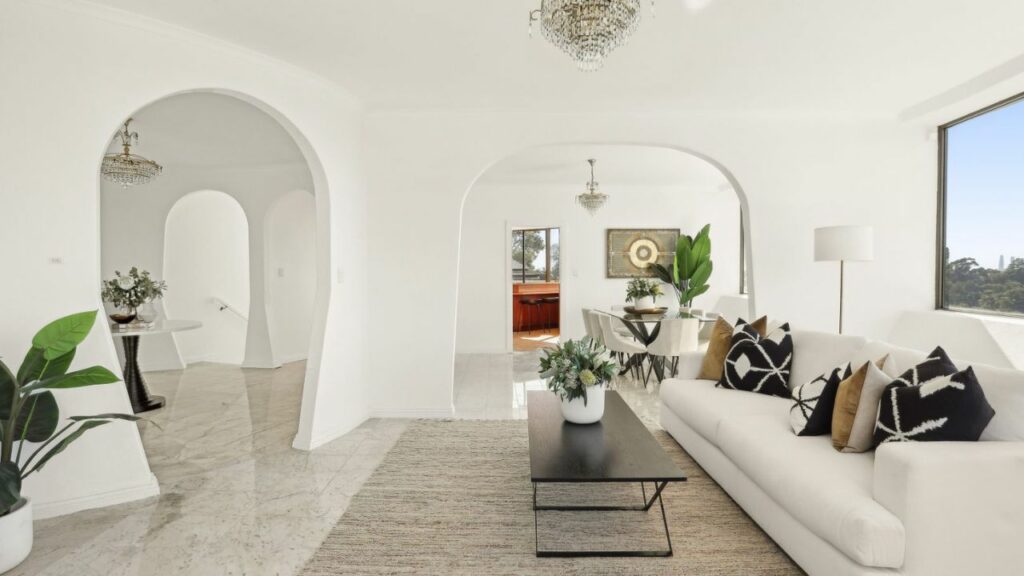 The listing describes the home as “an iconic landmark with a signature circular form”, with the unique floor plan resembling a spaceship with curved archways around the foyer.
