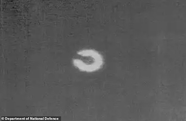 An internal email obtained by CTVNews had a Canadian brigadier-general describing it as such: ‘Top quarter is metallic, remainder white. 20-foot wire hanging below with a package of some sort suspended from it.’