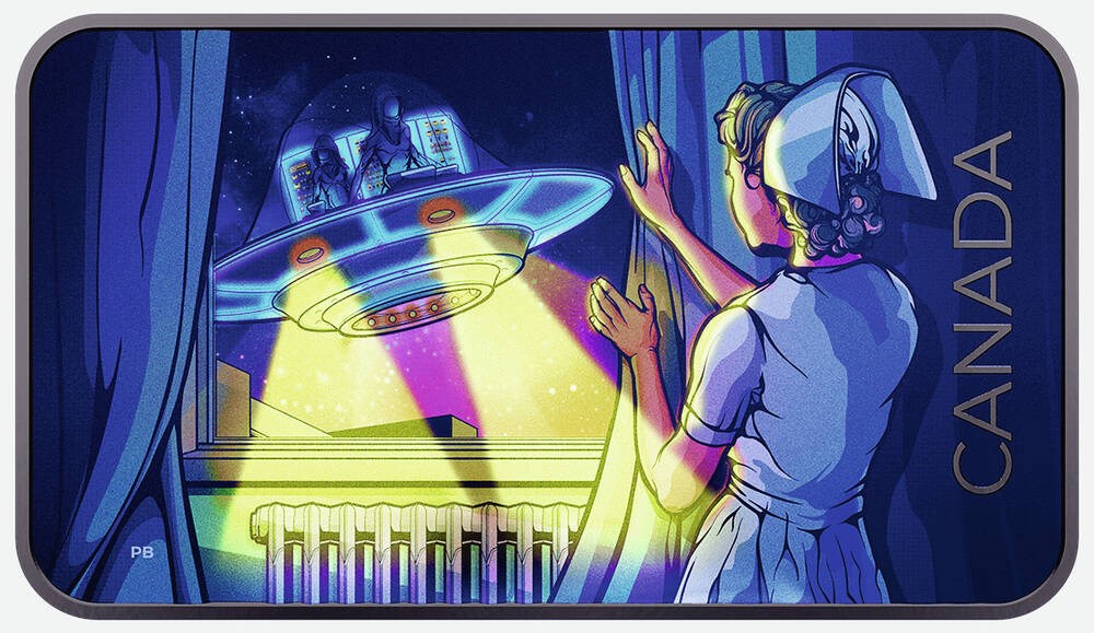 In information accompanying the coin’s release, the Royal Canadian Mint said the nurse was “absorbed by the sight,” and studied the craft and its occupants. She noticed one of the figures slowly turning to face in her direction. The other figure then reached down to grab a lever, and the tilted craft began to spin in a counter-clockwise direction.
