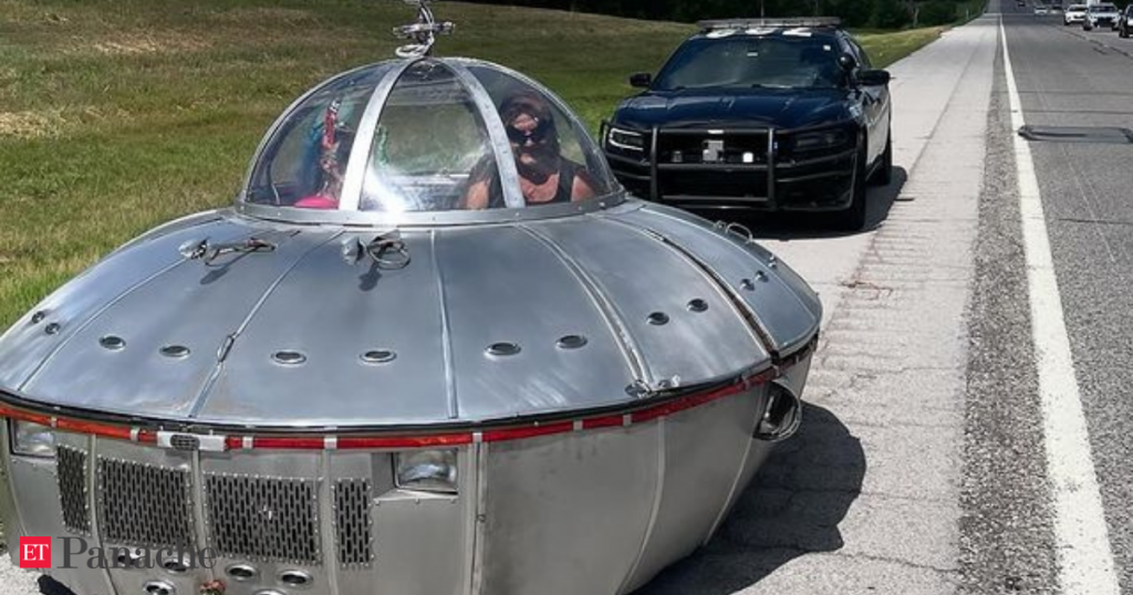 The Oklahoma Highway Patrol shared photos of the event on Instagram, noting, “It’s not every day you pull over a UFO. Trooper Ryan Vanvleck #722 pulled over this vehicle on the Turner Turnpike yesterday for an obstructed tag. They were on their way to a UFO festival in Roswell, New Mexico. Trooper Vanvleck let them go with a warning.” The post included two images, one of which featured Trooper Vanvleck taking a selfie with the unique vehicle.