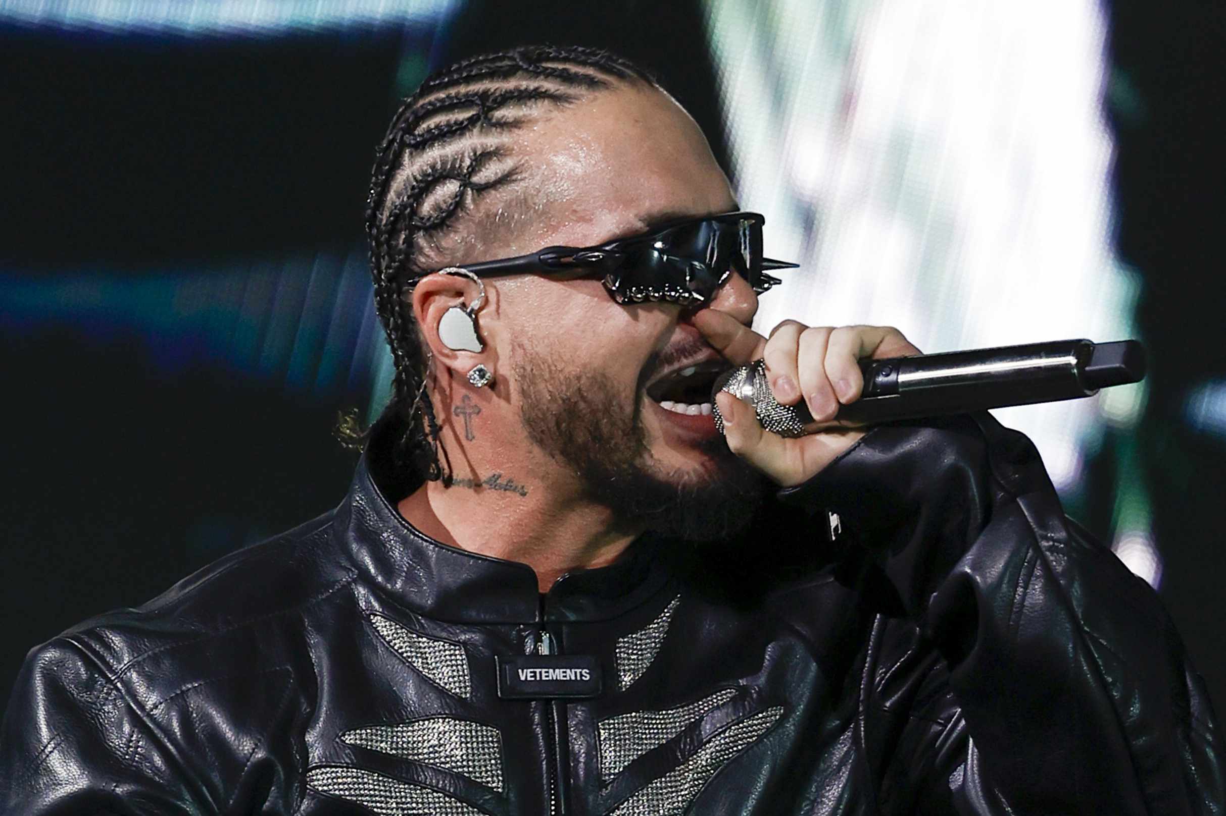 Leather moto jackets, giant jeans, sequined trucker gear, Vetements’ signature spiked Oakley sunglasses and a pair of well-worn J Balvin’s own Air Jordan 3 shoes inform the Colombian all-star’s on-stage wardrobe, but might as well also be a mission statement for today’s Vetements.