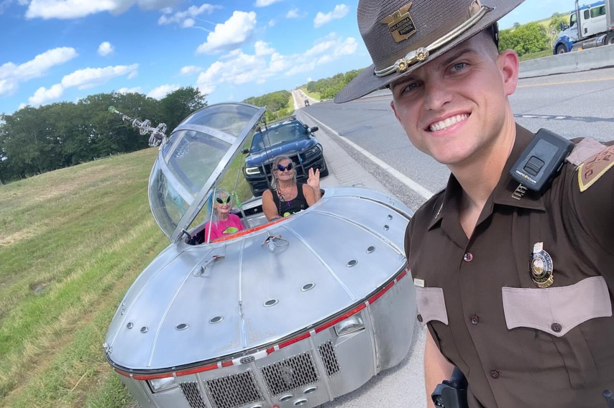 July 3 (UPI) — An Oklahoma Highway Patrol trooper had an otherworldly encounter when he pulled over an unusual UFO-shaped vehicle on the highway.