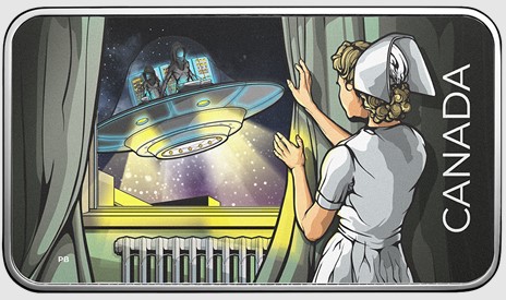 So called the “Duncan Incident” the coin seeks to capture the thrilling story of a nurse who spotted a large saucer-shaped UFO floating outside of a patient’s window.
