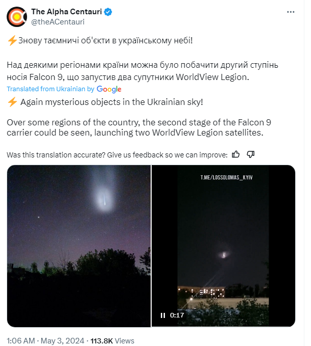 Ukraine, Alpha Centauri, a Ukrainian non-profit educational project, wrote that a mysterious white flash that was spotted over some regions of the country on Thursday evening was the exhaust spiral from a SpaceX Falcon 9 rocket launch from California’s Vandenberg Space Force Base.