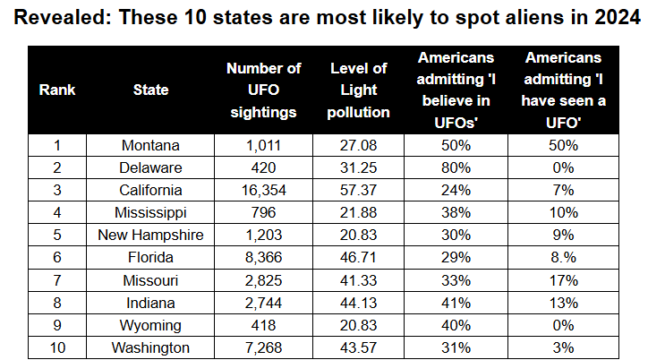 Montana is named the US state the most likely to spot a UFO, with 1,011 sightings in the state overall, and 50% of people in Montana admit to believing in UFOs, the most believers of any state
