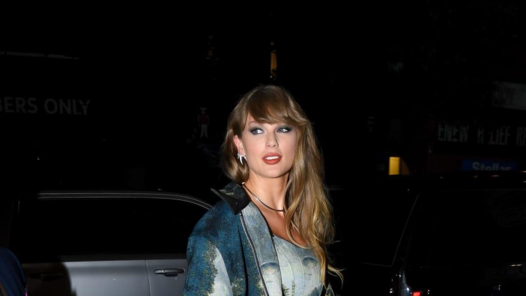 Taylor then hit up an after-party at Electric Lady Studio (the site of some of her most famous recordings), swapping out her UFO print dress for a similar UFO print top and skirt from Monse, paired with their tapestry jacket in the same pattern.