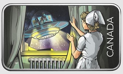 The latest collectible silver coin produced by the Royal Canadian Mint features an eerie scene by B.C. artist Patrick Bélanger, showing a nurse pulling back curtains to reveal a floating saucer-shaped craft with a glass-like dome, and two shadowy figures inside.